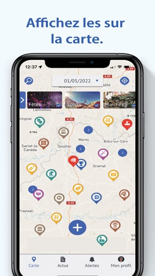 Chaque événement est publié sur la carte sous forme d'une icône en lien avec le thème. Cette icône apparaît en bleu puis change de couleur en fonction du nombre de participant. Plus l'événement publié compte de participants, et plus la couleur tendra vers des couleurs chaudes. Les événements rouges toucheront plus de 100 participants.