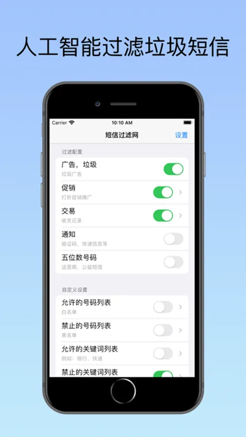 另外可针对设置自定义的电话号码和关键词的黑白名单,做到极高准确率的短信过滤。