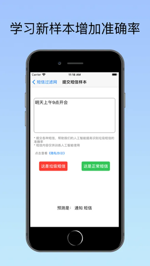 如有人工智能识别错误的情况,敬请各位用户提交短信样本,让模型识别的准确度越来越高。