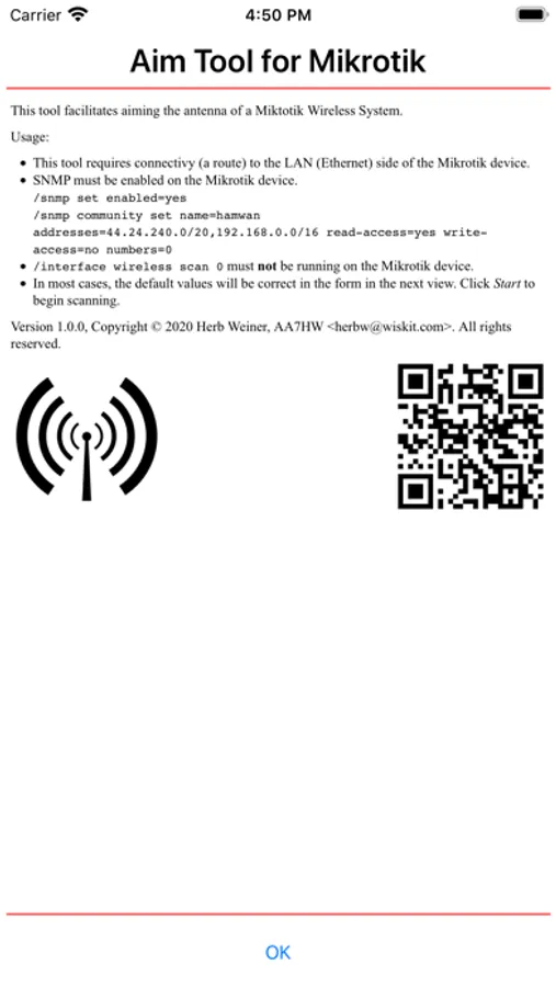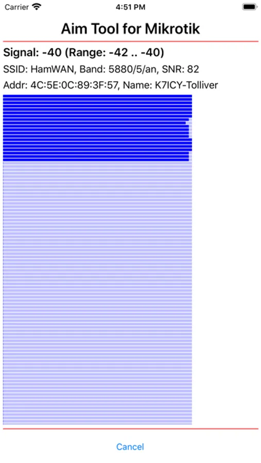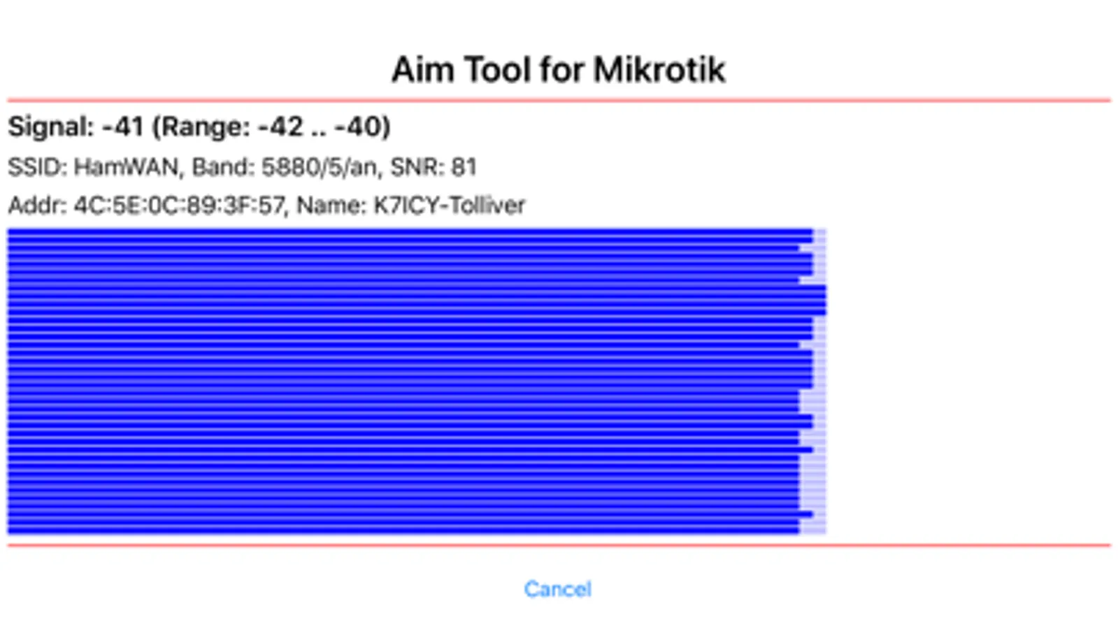Aim Tool for Mikrotik is an app to facilitate aiming the antenna of a Mikrotik Wireless System such as an LHG-5, by providing real time visual and audio feedback showing the signal strength. Mikrotik Wireless Systems are commonly used to obtain Internet connectivity using amateur radio (refer to http://www.oregonhamwan.org). In order to achieve the highest connection speeds over distances of 25 miles or more, the local antenna must be precisely aimed towards the remote sector on a distant tower.