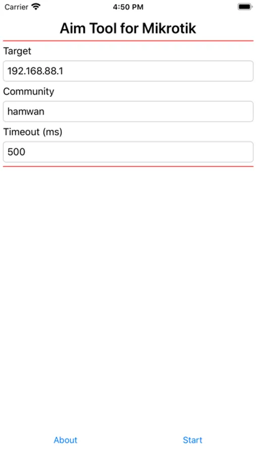 Connect the Ethernet interface of the Mikrotik system to the WAN (Internet) side of a wireless router, and choose the wireless router WiFi signal on your iPhone or iPad. Ensure that SNMP is enabled on your Mikrotik system. In most cases, the default Target (192.168.88.1), Community (hamwan), and Timeout (500 ms) will be correct. Press start to begin monitoring.