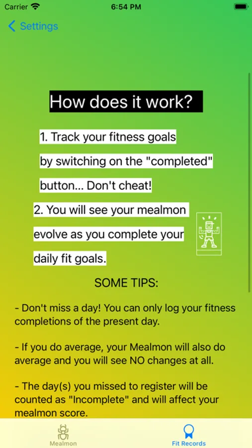 Mealmon will provide the motivation to keep you going and stick to your diet and exercise! But if you do average, your mealmon will also do average and you will see no changes at all.