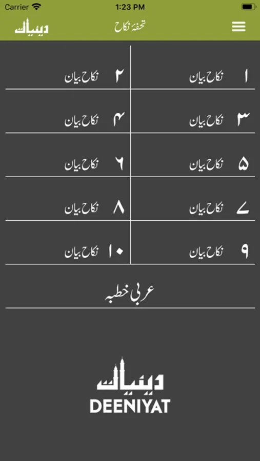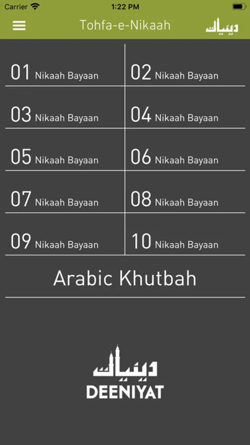 The app provides 10 diffrent Nikaah bayans each with 10 diffrent topics. It also has Arabic Khutbah used for the Nikaah.