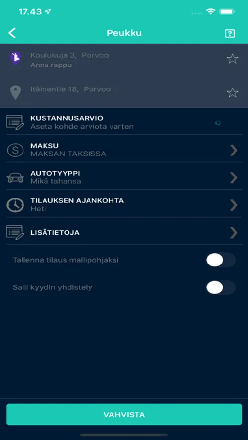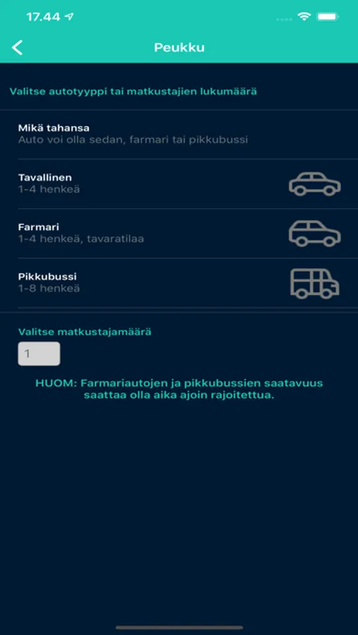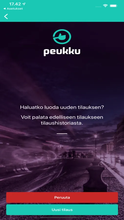 Peukku paikantaa sijaintisi, muista tarkistaa, että laitteesi paikannus on toiminut oikein. Voit myös antaa muun lähtöosoitteen kuin sijaintisi. Voit halutessasi valita autotyypin, maksutavan ja antaa kirjalliset ohjeet kuljettajalle. Voit myös valita tilauksesi pohjaksi jonkin edellisen Peukku-kyytisi.