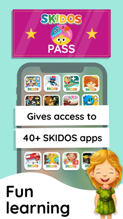 With a single Pass, you access all SKIDOS apps where children of different ages will find games to every taste. You can create up to 6 player profiles within one account and log in from multiple devices. Go ahead and customize the app experience for your kids according to their interests and learning level. Stay on top of how your kids learn - check the progress report in the app or via email.