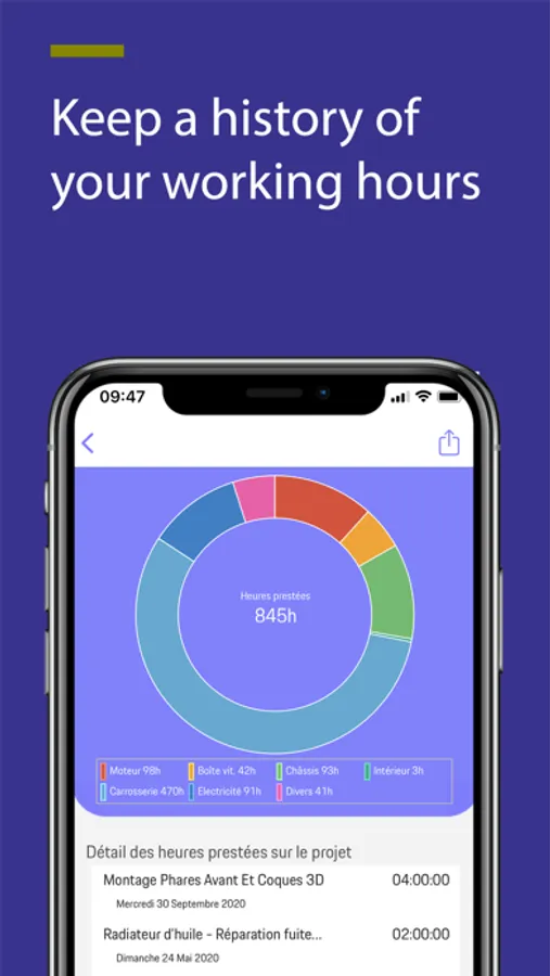 TIMESHEET - you keep track of the time you spend on each of the stages of restoring your Oldtimer. You can even print or share a report and why not, for professionals, export it to a spreadsheet or accounting software.