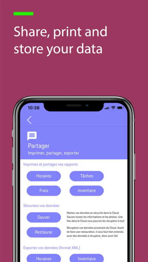 SHARING - Print reports, share information, export data in XML to other applications. Ferdinand is there for that too. In addition, in the "pro" version, you can backup and restore your data from the cloud. You can thus use Ferdinand on several iPhone and iPad.
