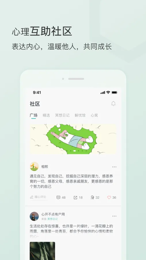 社区——广场、精选话题、解忧馆和冥想日记,你可以在这里敞开心扉,找到相互温暖、一同成长的伙伴