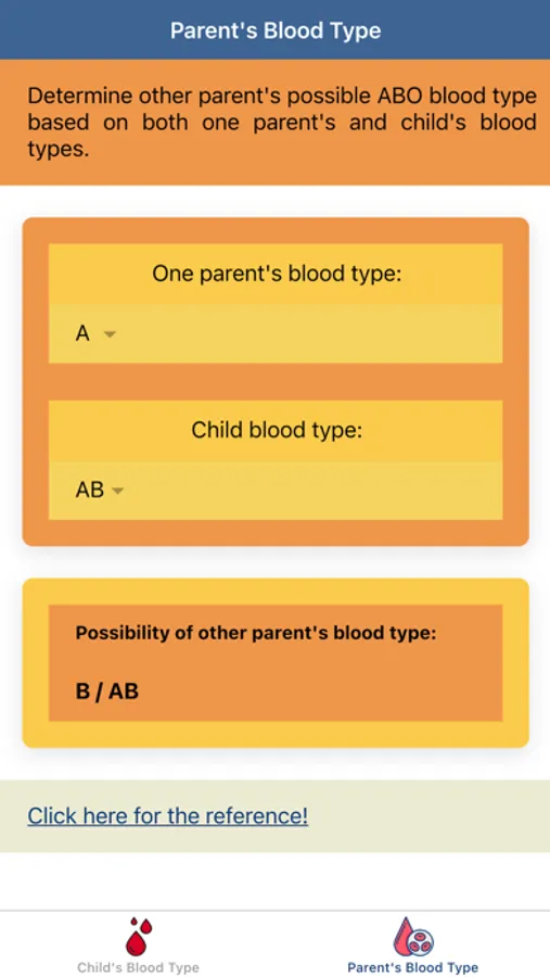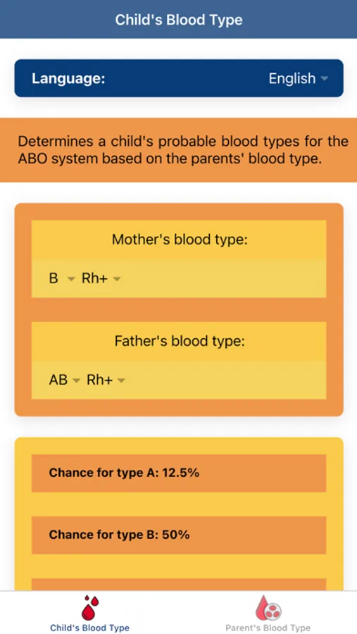 "Pocket Blood Type Calculator - Blood Test & ABO Probability" is a mobile app designed to help user determine the probability of the blood type of their children if the user knows the blood type of both parents. This will be useful before performing blood test for red cross blood donor because we can anticipate our blood type. "Pocket Blood Type Calculator - Blood Test & ABO Probability" also has a feature to determine the possibility of the other parent blood type if the blood type of one of the parent and the children are known. If you know your blood type, you also can know your blood type diet and eat right for your blood type.