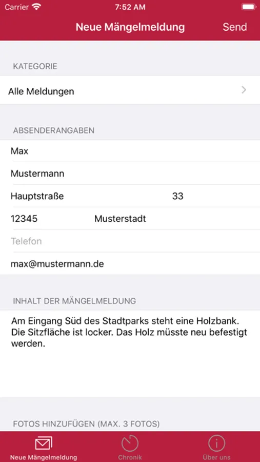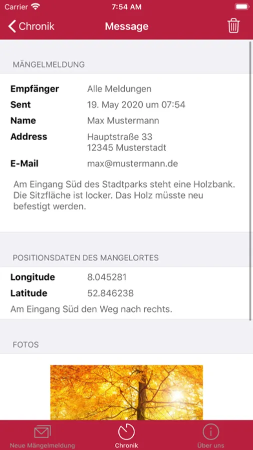 - bei Bedarf Fotos und die aktuellen GPS-Positionsdaten hinzufügen