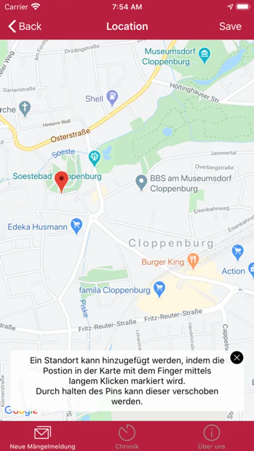 Die Kümmer-App ist für alle, die auf Missstände in der Stadt Cloppenburg hinweisen möchten, damit sich die Verwaltung möglichst schnell und unbürokratisch darum kümmern kann. Wenn Sie in Zukunft beispielsweise eine defekte Straßenbeleuchtung, einen nicht gestreuten Gehweg oder Schlaglöcher in der Straße entdecken, können Sie diese direkt über das Smartphone der Stadt melden.