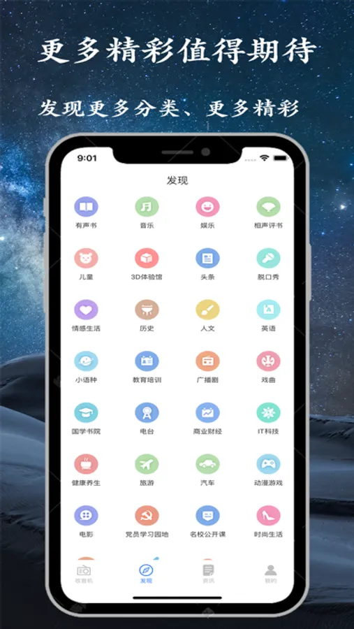 7、本App涵盖 音乐、新闻、经济、交通、都市、体育、外语 等分类满足每个人的需求。
