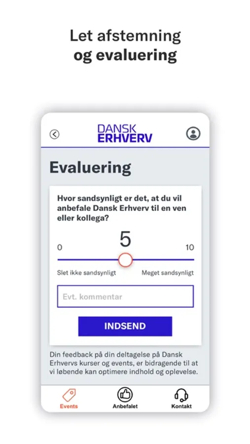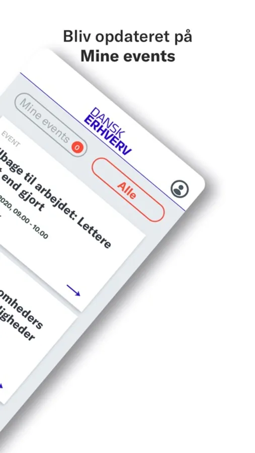 “Events” med oversigt over Dansk Erhvervs events og kurser. Du har mulighed for at medbringe din billet digitalt, deltage i afstemninger og evaluere vores arrangementer.