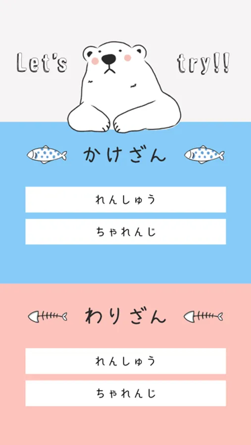 2.ちゃれんじは、かけざん、わりざんのタイムトライアルチャレンジ!早く答えられれば答えられるほど、レアな魚をゲットできます。是非まぼろしの魚をゲットしてください!