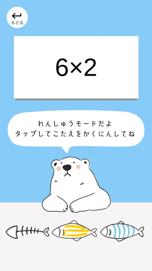 1.れんしゅうモードでは、かけざん、わりざんを、暗記カード形式で見ながら練習します。タップだけの簡単操作で、しっかり暗記をサポートします。