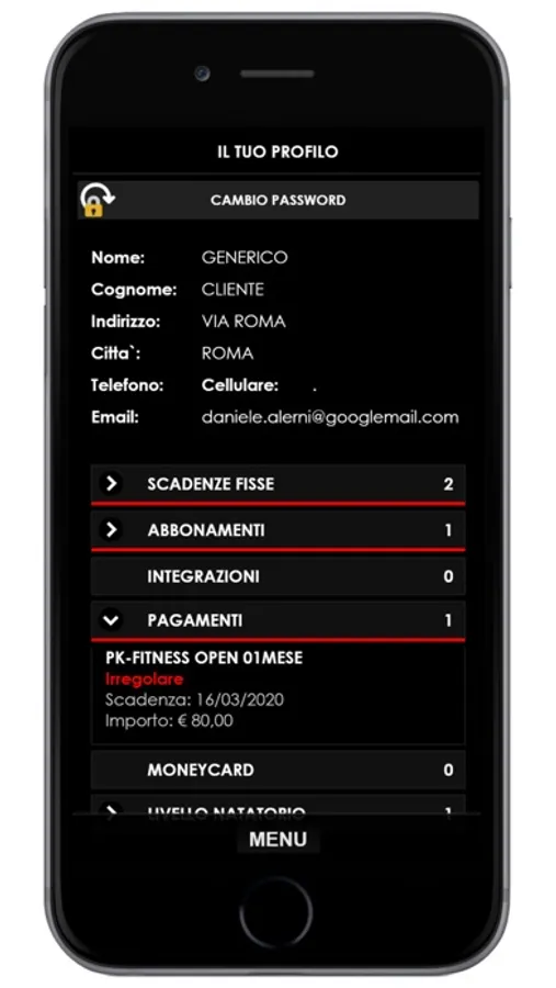 L'APP ideale per gli iscritti, il personale ed il management di un moderno centro fitness. Gli iscritti possono verificare il proprio abbonamento, le scadenze, il certificato medico ed i pagamenti, prenotare i corsi ed i servizi, acquistare abbonamenti e prodotti, verificare il piano di allenamento ed interagire con lo staff del centro visualizzando messaggi e comunicazioni riservate inviate dal proprio consulente commerciale ed istruttore. Il personale del centro, può verificare la propria agenda ed inserire appuntamenti, pianificare le attività di CRM e registrare le presenze degli iscritti alle lezioni e servizi erogati. Il Club manager può effettuare verifiche sull’andamento del Club e monitorare il lavoro del personale.
