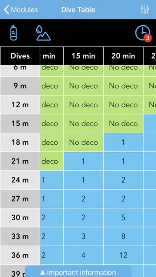 • Account for up to 6 consecutive dives with surface interval to account for residual saturation while computing the dive table