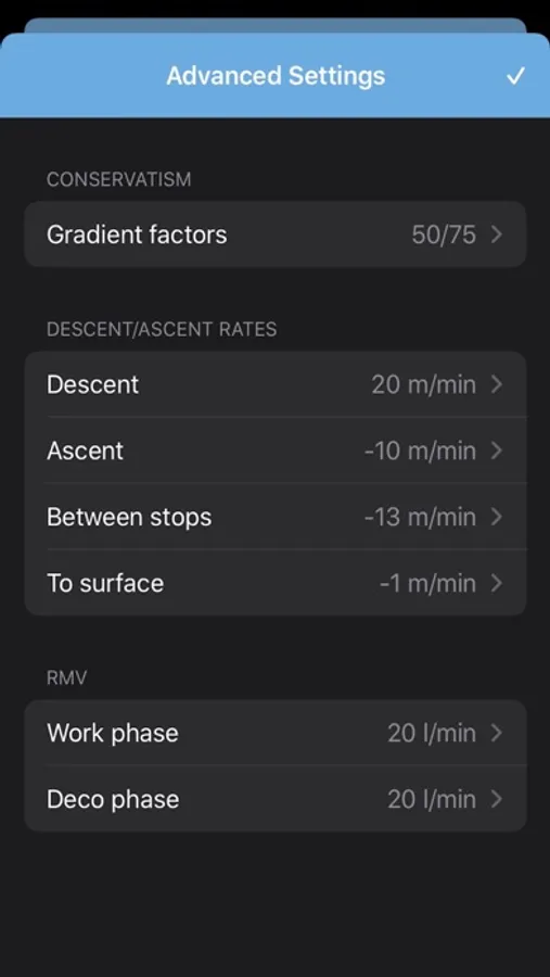 • Uses Bühlmann decompression model ZH16L-C with user selectable gradient factors as conservatism