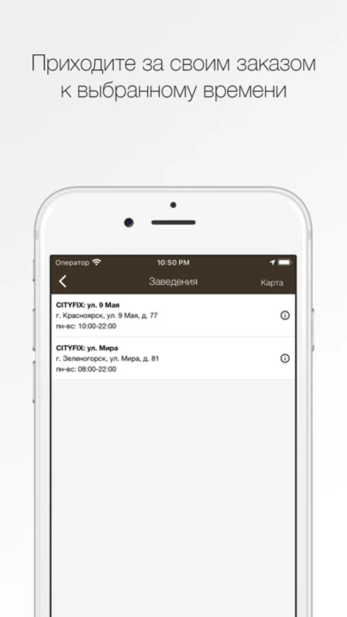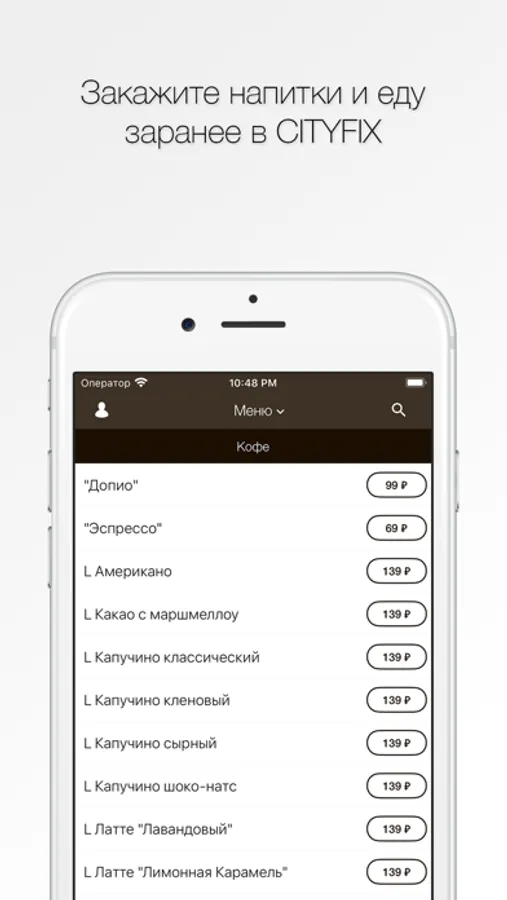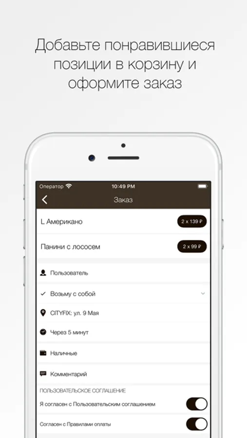 Как сделать заказ в приложении “CITYFIX”: выберите понравившиеся позиции из меню, добавьте их в корзину и перейдите на экран оформления заказа (по нажатию на иконку корзины).