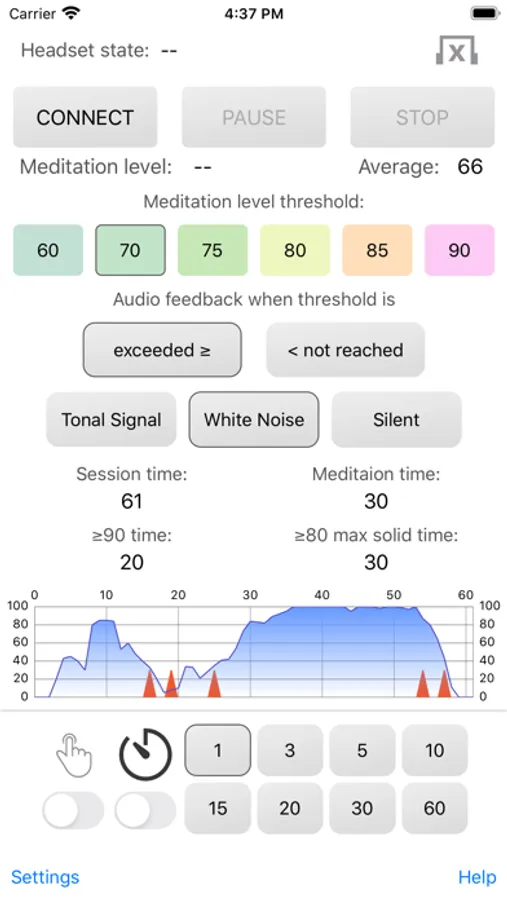 Close your eyes, and hear the sound once you reach the desired meditation level. Try to stay meditating as long as you can. Your achievements will be logged and shown in visual form. With regular practice, you'll be able to improve the length and deepness of your meditation - and demonstrate your skill to others.