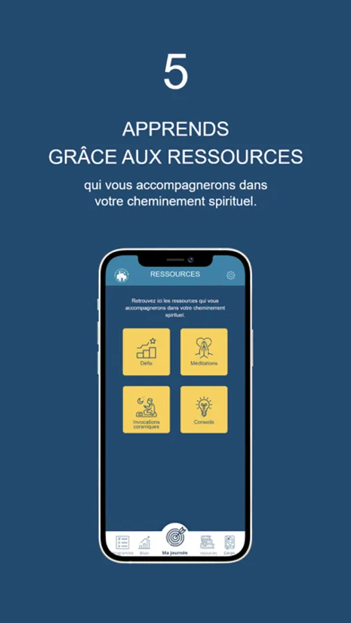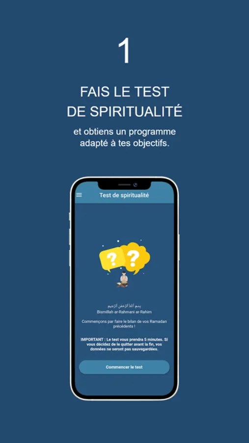 L’application vous propose un test de spiritualité qui vous permettra d’obtenir un programme personnalisé pour ce mois du Ramadan et de faire le suivi quotidien de vos objectifs réalisés tout en vous motivant jour après jour à travers des rappels, des conseils pratiques ainsi que des défis à relevés !