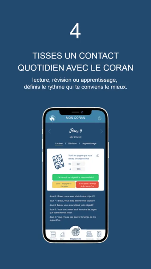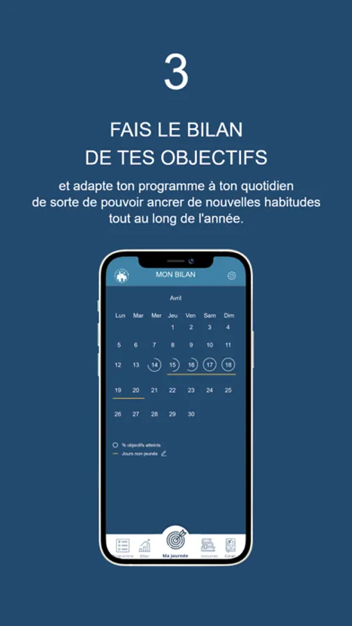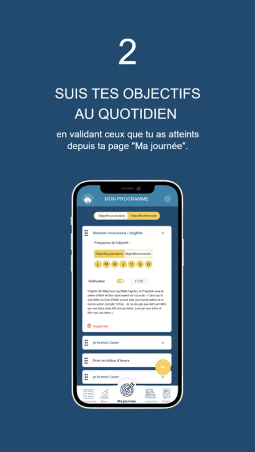 Objectif Ramadan vous permet également de faire le suivi de votre programme quotidiennement et ainsi bénéficier d’un bilan complet de votre mois sur les objectifs réalisés.