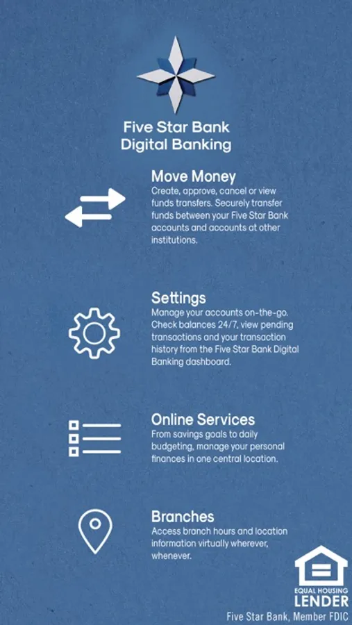 Meet the branch that never closes. Five Star Bank Digital Banking allows you manage your financial well-being right from your mobile device. With this app you can:
