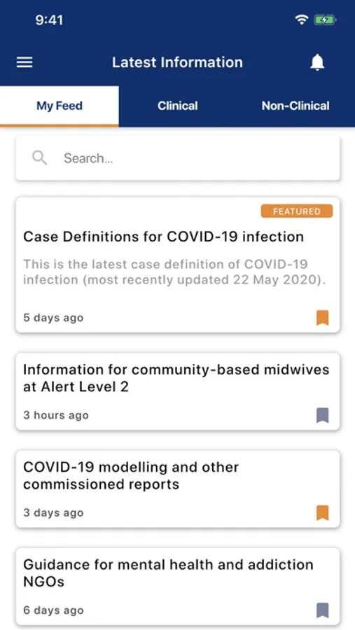 Essential information such as the COVID-19 case definition is easy to find, featured at the top of your Latest Information feed. You can bookmark your favourite articles to read later, giving you quick access to the information you need at the touch of a button, even when you are offline.