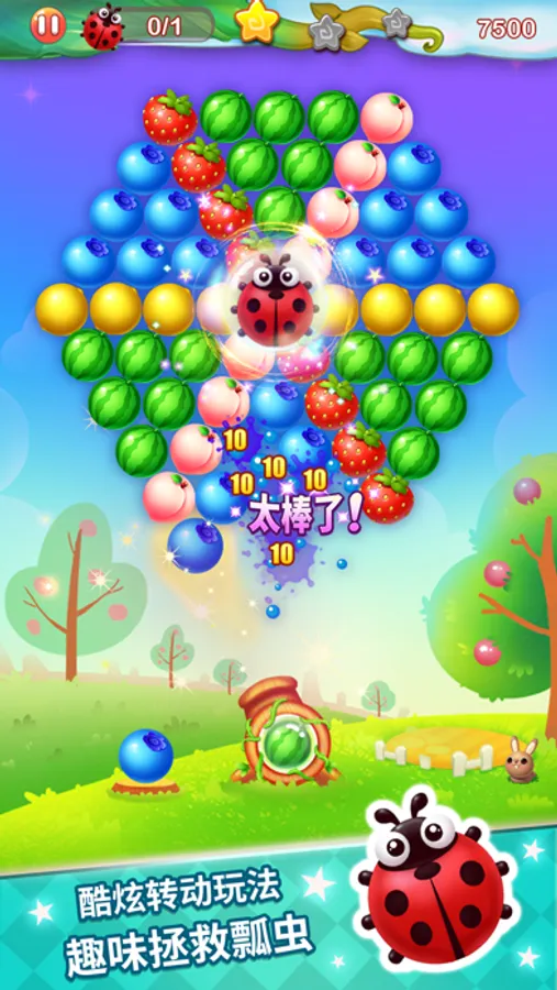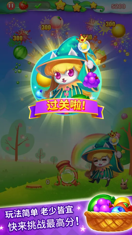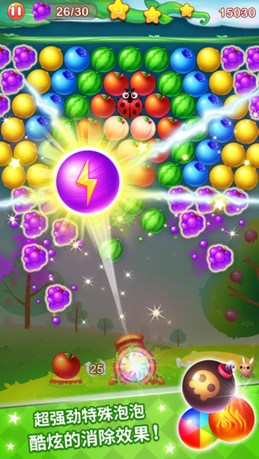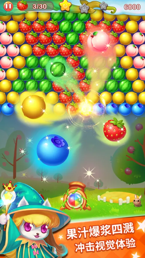 《水果泡泡传奇》是一款可爱的全新策略类休闲游戏。在缤纷多彩的水果泡泡群中,和小女巫猫安吉拉并肩作战,一起闯关。和她一起解救被困的小猫咪,一起捕捉水果上的七星瓢虫,一起收集星光。连击还会有意想不到的道具奖励,让你轻松完美通关,赶快加入我们吧! 让手指划出你的机智,来一场说走就走的水果泡泡之旅吧。