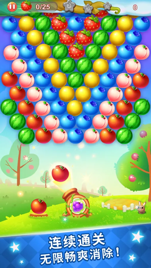 屏幕上滑动手指,调整瞄准线,松开手指发射水果,如果打中了同种水果并且达到3个以上,就会消除了!连击越多,得分越高哦,还可以奖励道具!