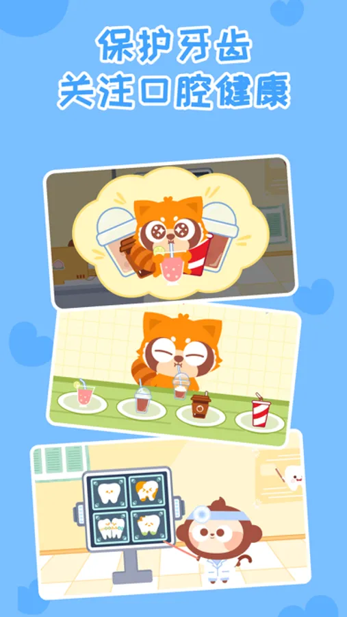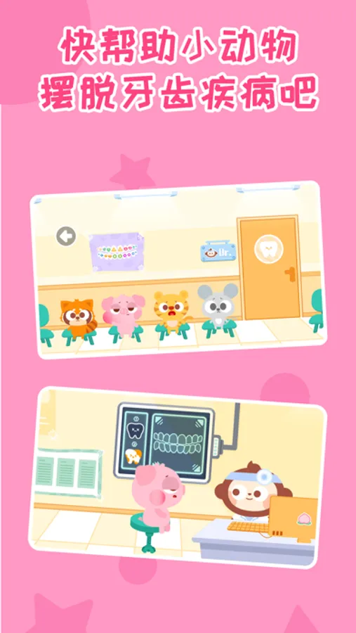 DuDu's Dental Clinic simulates the scene of a real dental hospital to create a relaxed and lively atmosphere for medical treatment. Children can role-play as an all-around little dentist to solve oral diseases for the animals waiting for treatment.
