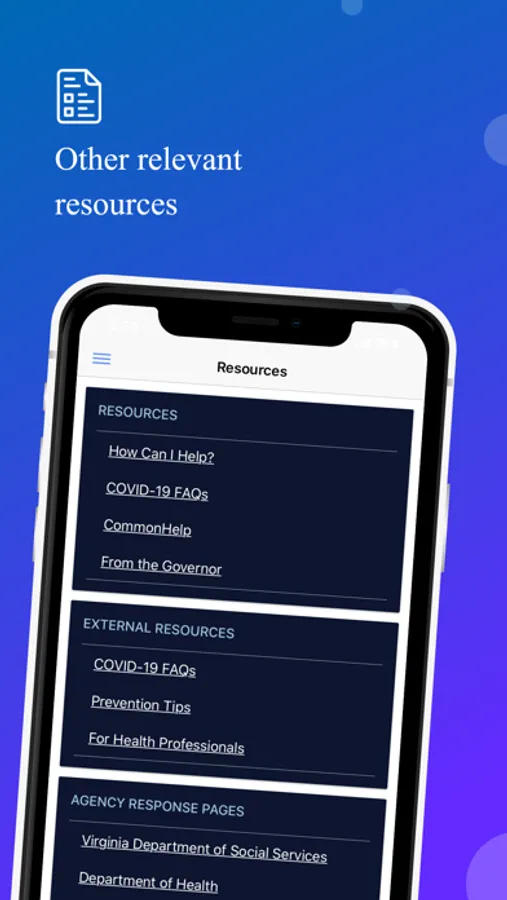 The COVID-19 Virginia Resources app provides actionable resources and support for individuals, families and businesses facing COVID-19-related challenges. Along with the latest news and updates on COVID-19, users can also search for local resources, access Virginia’s online system to apply for assistance, and connect to vital information and guidance from other agencies throughout the Commonwealth of Virginia.