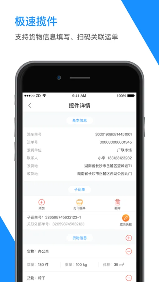 √极速揽件:支持货物信息填写、扫码关联运单。