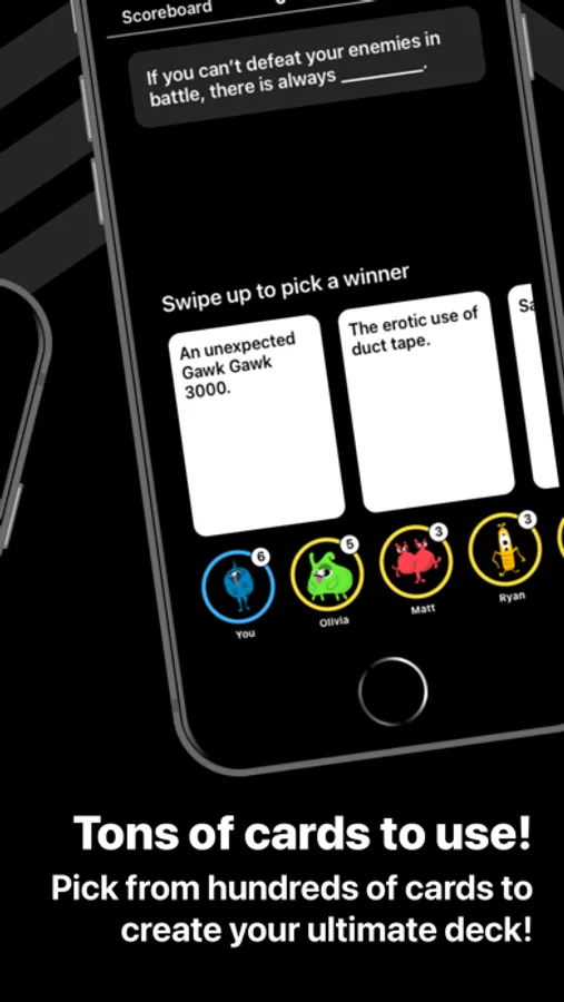 2. During the players selecting phase, everyone but the judge will have the chance to submit and cards they want with the given black card. Your goal is to create the best phrase by filling in the blanks.