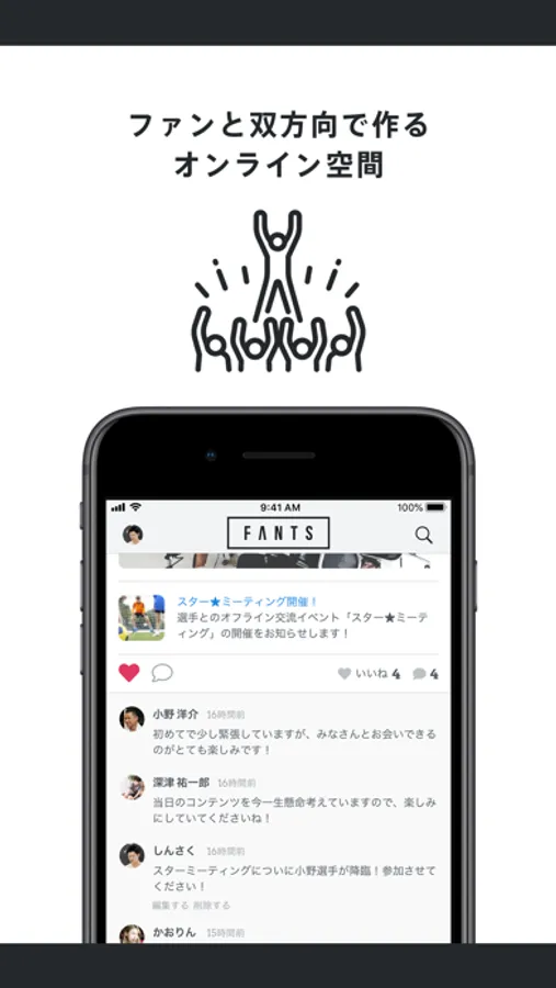 オンラインファンサロンアプリ「FANTS」を通じて、チームやアーティストの専用サロンを通じて、手軽にコミュニケーションをとることができ「つながり」を実現します。