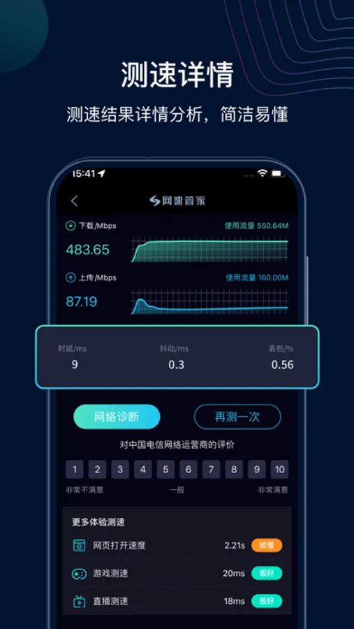 【一键测速】一键测网速,测试宽带、Wi-Fi、4G、5G网速,提供下载速度、上传速度、网络延时、网络丢包和网络抖动数据 ;记录测速历史,轻松查看及分享测速记录。