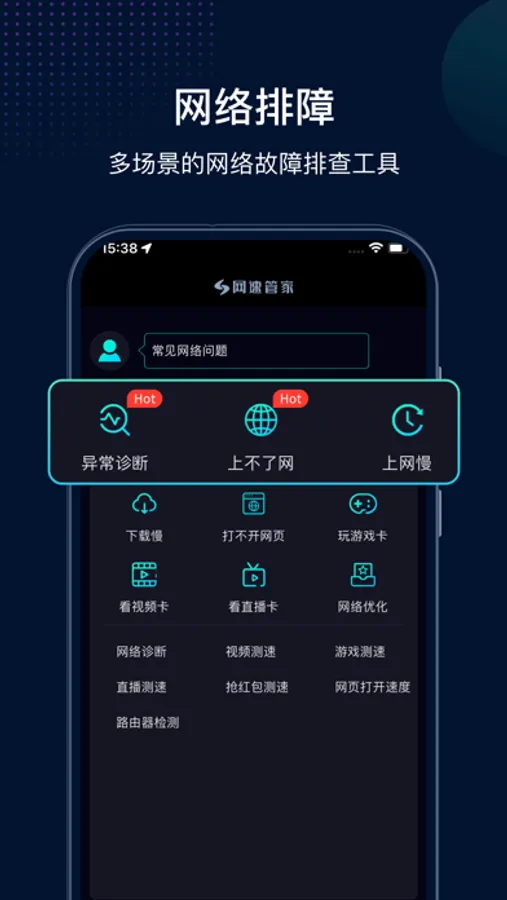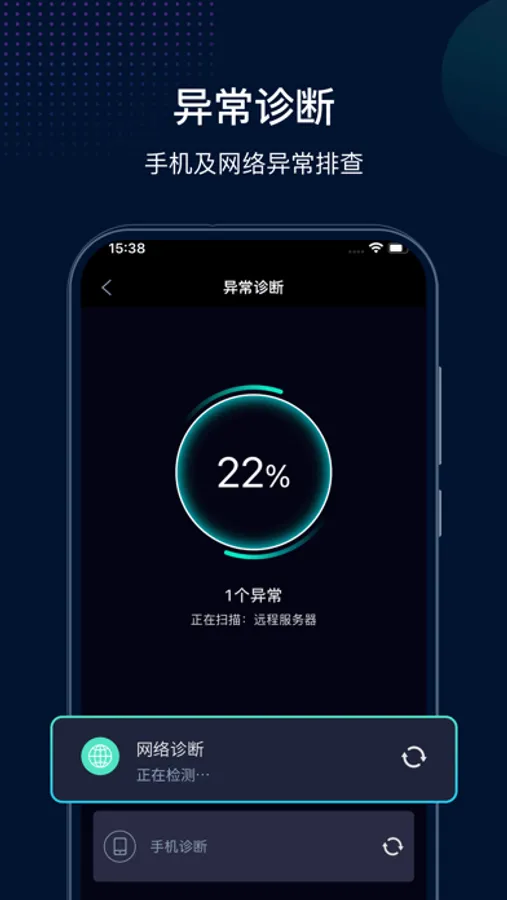【异常诊断】一键诊断上网设备的硬件及网络异常,帮助用户快速定位问题,解决问题。网络诊断包括网络类型、信号强度、信号频段、互联网网络性能、DNS、内网IP、外网IP、网关、网络认证、应用服务器、远程服务器、实时网速等进行检测。手机诊断包含CPU使用率、CPU温度、手机品牌、手机型号、操作系统、版本好等进行检测,生成检测报告。