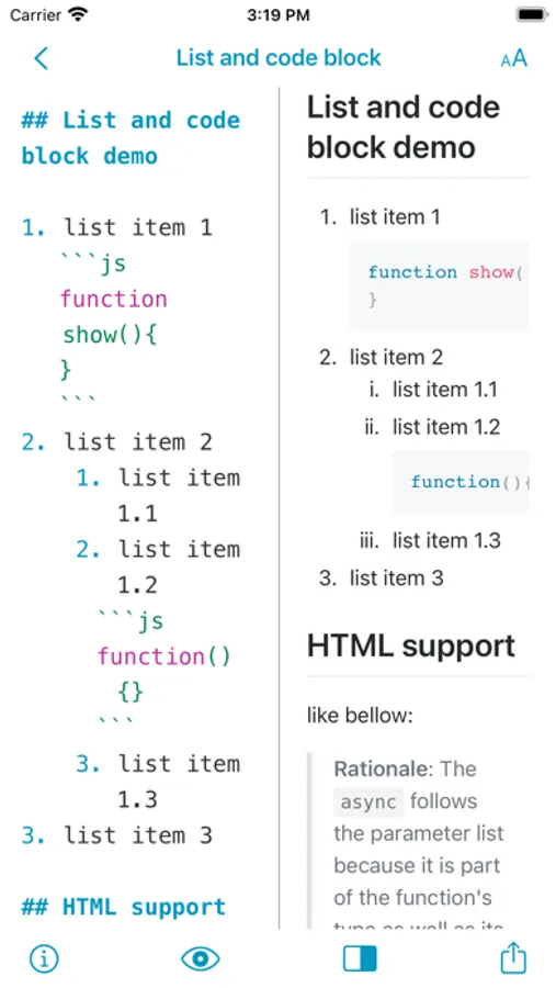1. Fully supports CommonMark standard and GitHub Flavored Markdown (GFM).