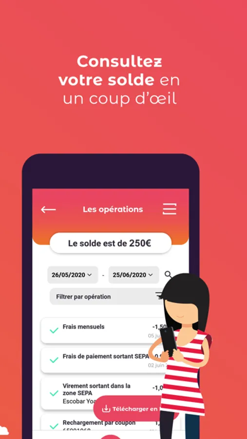 • Consulter votre solde et vos transactions en un coup d’œil et en temps réel.