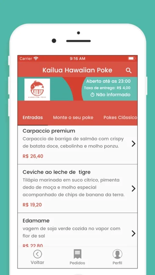 - cardápio ilustrativo, com preços dos produtos;