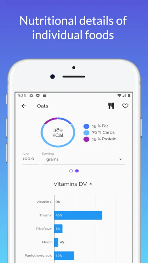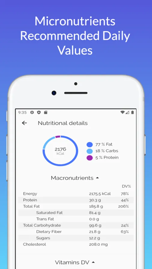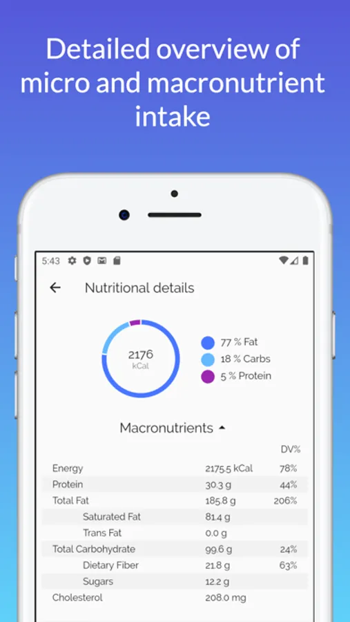 ● Track intake of all nutrients - calories, macros (carbs, fat, protein), sugar, fiber, cholesterol, vitamins, and more