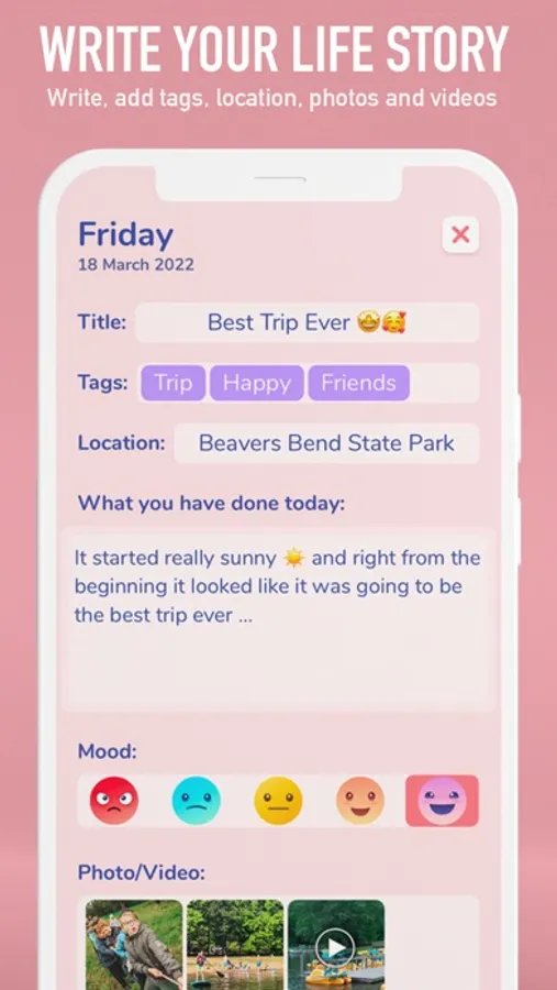 • Add photos from your gallery or add a mood emoji to each entry and express your emotions easily!