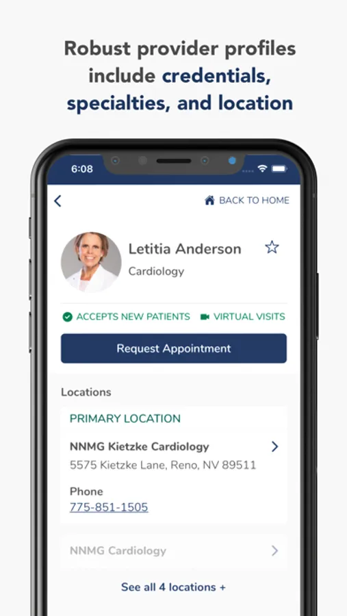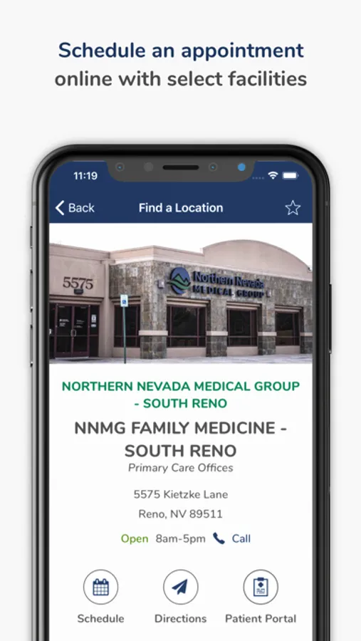 The NNMC app gives you the location and directions to the nearest Northern Nevada Medical Center facilities based on the type of care you need. It also allows you to search providers, schedule an appointment, view your health records, pay bills, and find nearby amenities like restaurants, gift shops and florists.