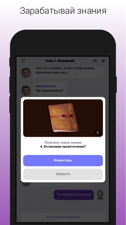 Получайте предметы и используйте их. История основана на книге по выживанию, вы научитесь вместе принимать правильные решения и заработаете вместе с героем знания по выживанию и оказанию первой помощи.