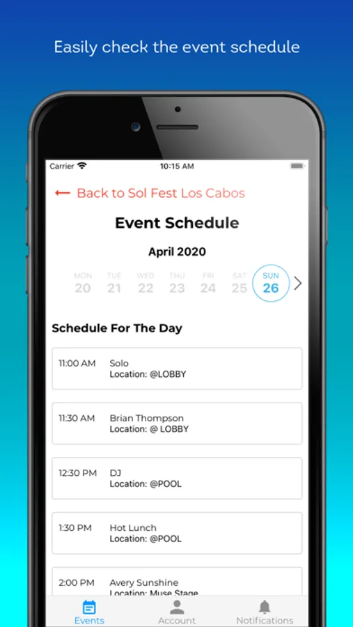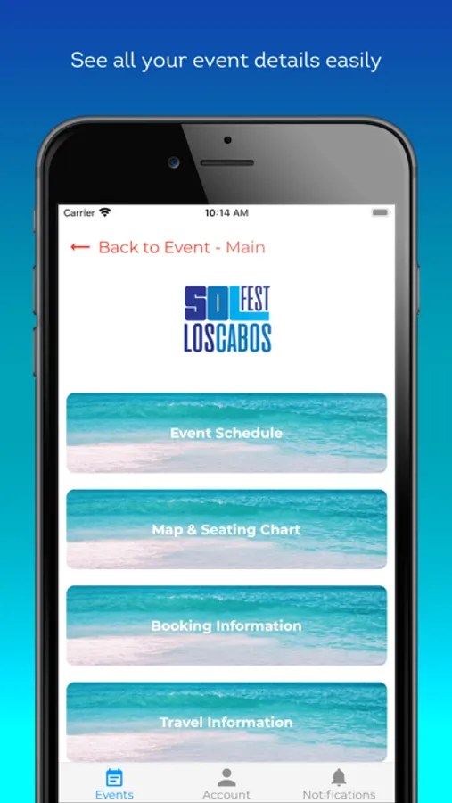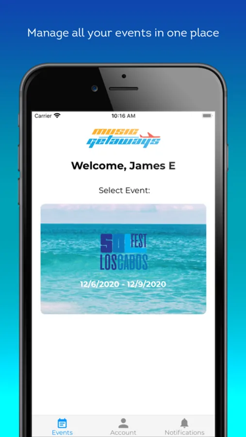 Music Getaways brings you a convenient way to access all your information regarding your upcoming all inclusive travel getaway. You will be able to retrieve your past and upcoming events details. You now have a way to also view your events schedule and always be up to date on any changes to your itinerary.