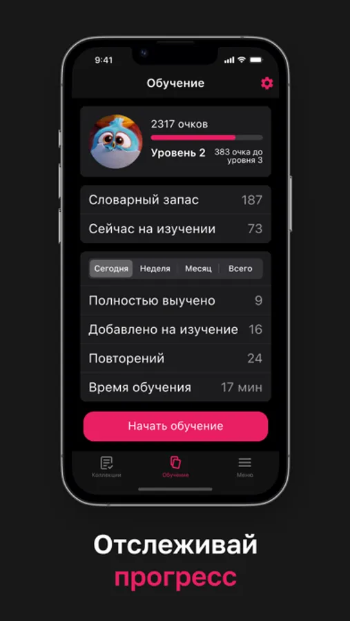 По мере изучения новых слов у тебя будет расти уровень внутри приложения. Это поможет тебе сохранять мотивацию и не бросать занятия. Удачи!