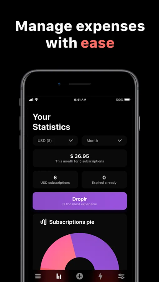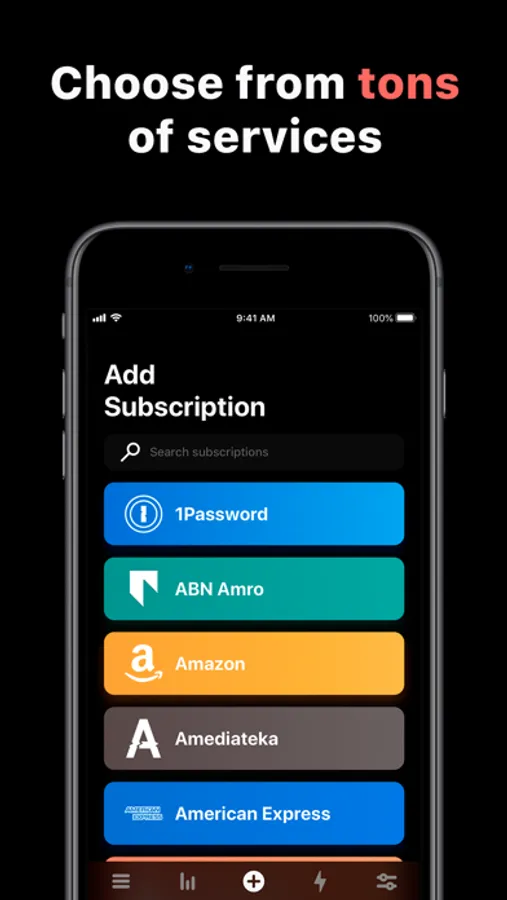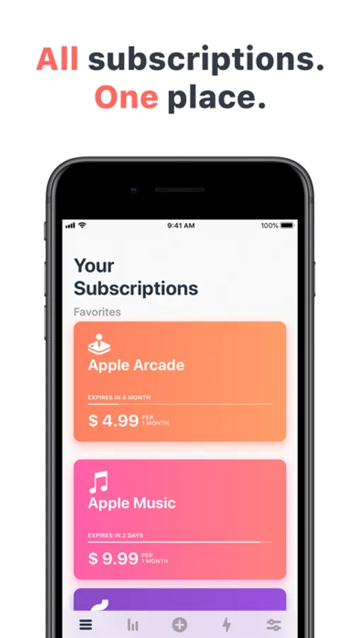 Control all of your subscriptions within a single app. Add your favorite services and observe information about how much time left before their expiration. Control you expenses with detailed stats screen and get notified about upcoming bill dates.