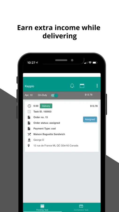 Deliver and earn extra income in your free time with Kepplo. It's simple and easy to use. Accept a task from our partner restaurant on the app and receive all the details of the order and delivery address for where the order is to be delivered.