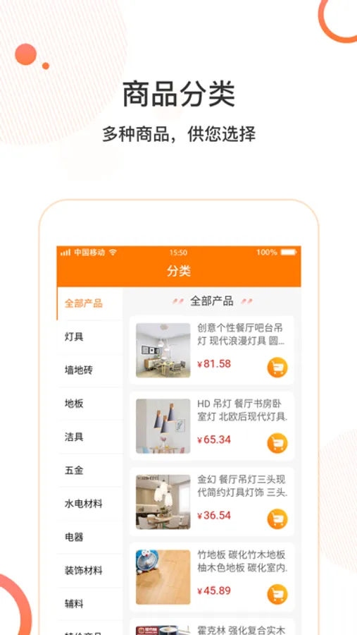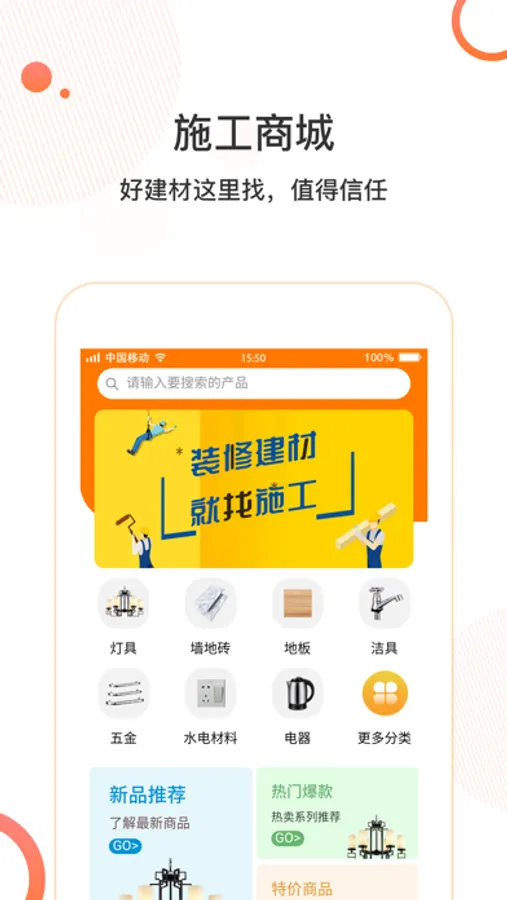 施工商城APP是一个以商品展示、产品推荐、收藏产品、购物车、在线支付、订单管理等功能为一体的电商平台。主要用于销售墙地砖、吊顶、水电材料、辅料、五金、洁具、地板、电器、开关、板材、灯具、建筑材料、装饰材料等商品。主要消费人群为准备装修或正在装修的人群。