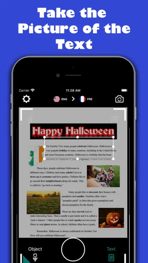 Take a photo of any object with text on it or select a photo from your gallery. The app will scan the text and translate it into any language.